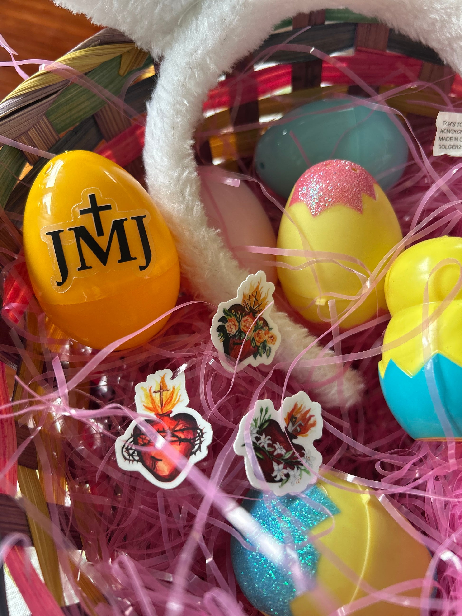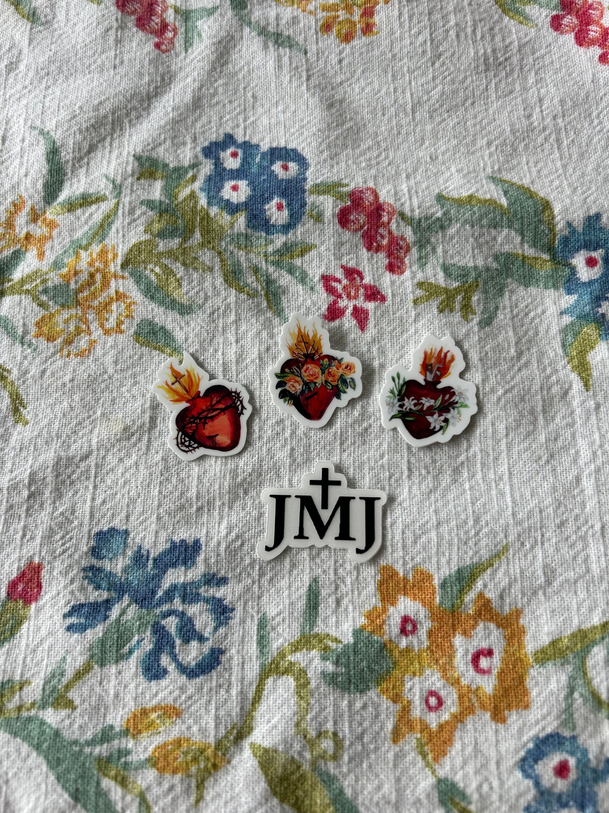 These Stickers are 1" tall and SO CUTE. They come in packs of four- one mini 1" Sacred Heart of Jesus, one mini 1" Immaculate Heart of Mary, one mini 1" Most Chaste Heart of Joseph, and a mini *clear 1" JMJ sticker!