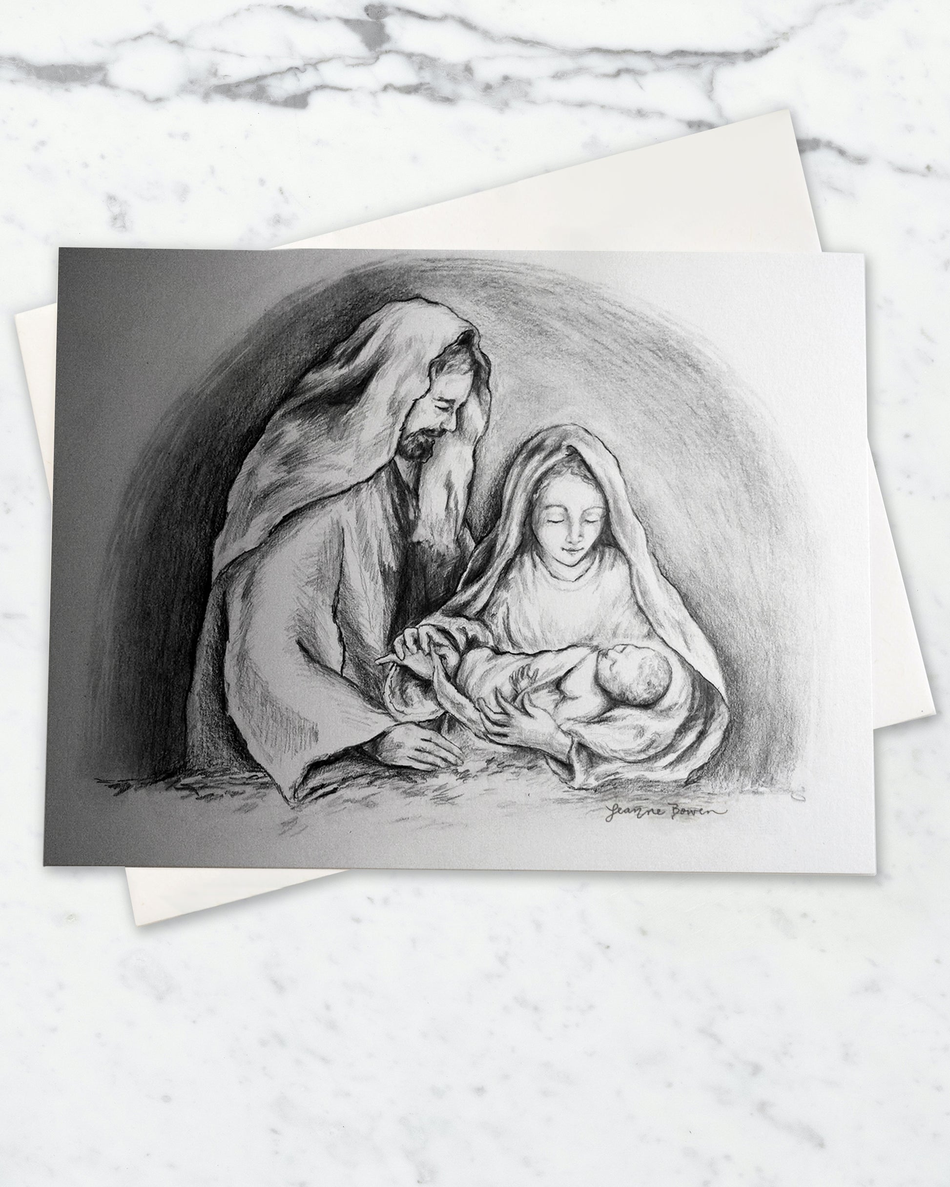 The 25 Card Pack includes a 5 pack of each of the 5 card varieties! It includes 5 Holy Family Cards, 5 Bundle of Light Cards, 5 Merciful Heart of the Christ Child Cards, 5 O Holy Night Cards, and 5 Saint Nicholas Cards. All cards are blank inside except for the Holy Family Cards. The Holy Family are stamped inside with “Merry Christmas” as shown in the last image.